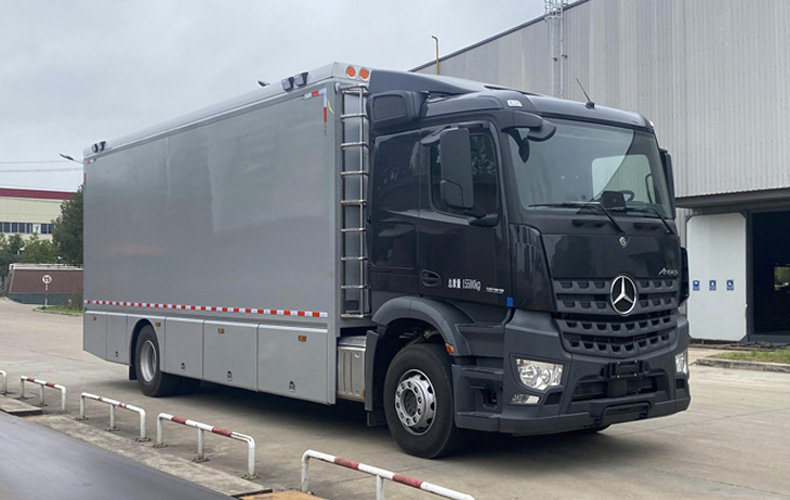 車頂封閉切不可開啟。該車主要用于戶外維修,主要專用裝置為工具柜,線纜盤,工具箱,絞盤,電焊機(jī),空氣壓縮機(jī)。側(cè)后防護(hù)均采用裙邊結(jié)構(gòu),后防護(hù)下邊緣離地高度500mm。EBS系統(tǒng)型號(hào)/生產(chǎn)企業(yè)為:EBS4+/WABCO。
